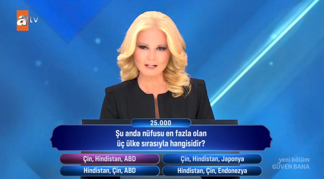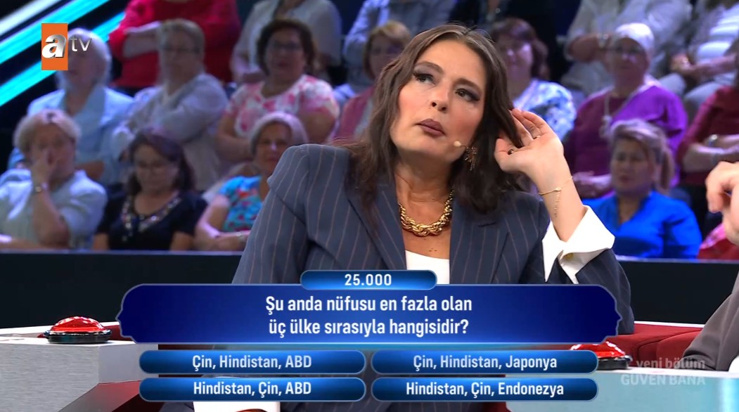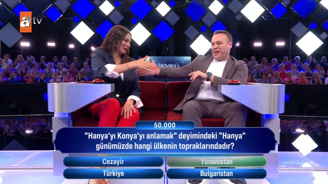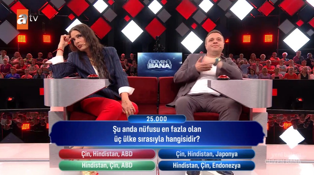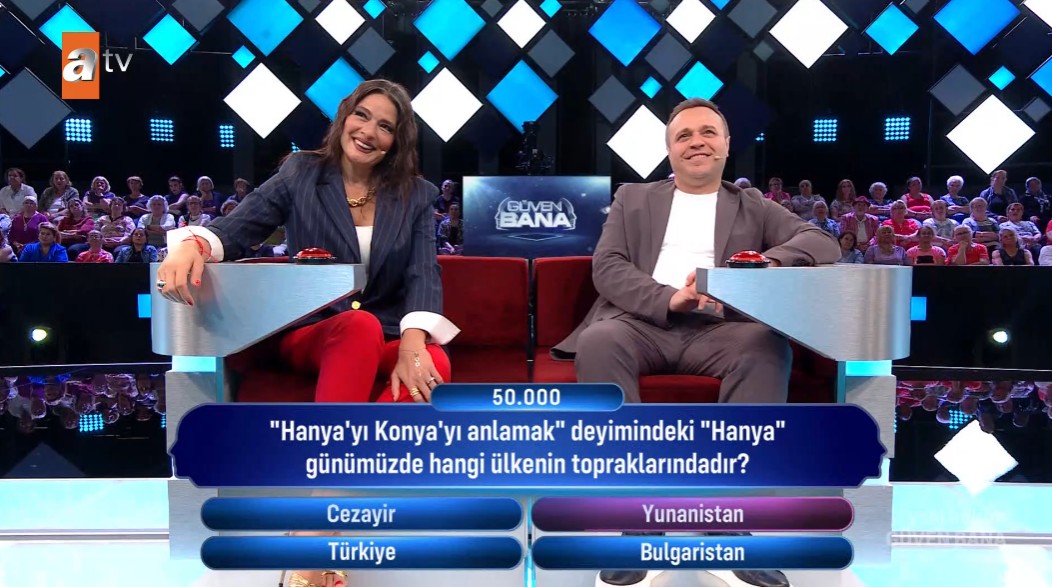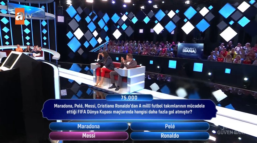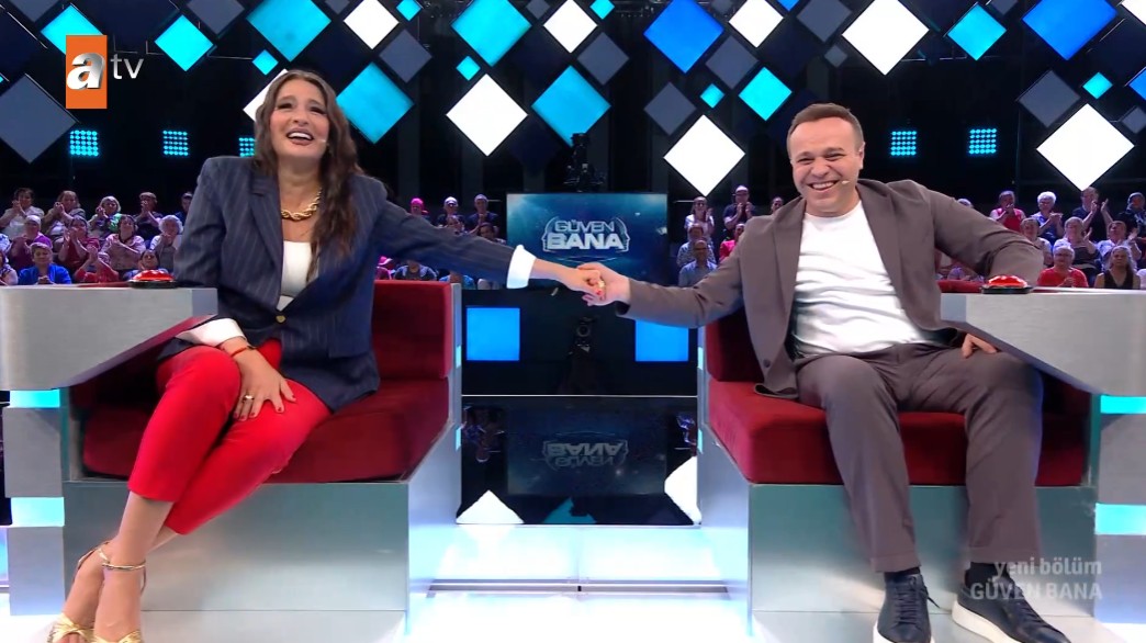 atv'nin sevilen yarışma programı Güven Bana, her Salı ve Perşembe akşamları seyircisini ekrana kilitlemeye devam ediyor. Müge Anlı'nın sunumuyla 29 Temmuz Salı akşamı yeni bölümüyle ekrana gelen Güven Bana'nın bu haftaki yarışmacılar bilgi yarışmalarının sevilen sunucuları Asuman Krause ve Alper Ateş oldu. Birbirinden zorlu yarışmaları büyük bir özveri ile cevaplayan Krause ve Ateş, gecenin ilerleyen dakikalarında karşılarına çıkan FIFA Dünya Kupası sorusuyla oldukça eğlenceli dakikalar yaşadı. Sevilen sunucular bakın ne yanıt verdi? İşte gece boyunca yaşananlar...