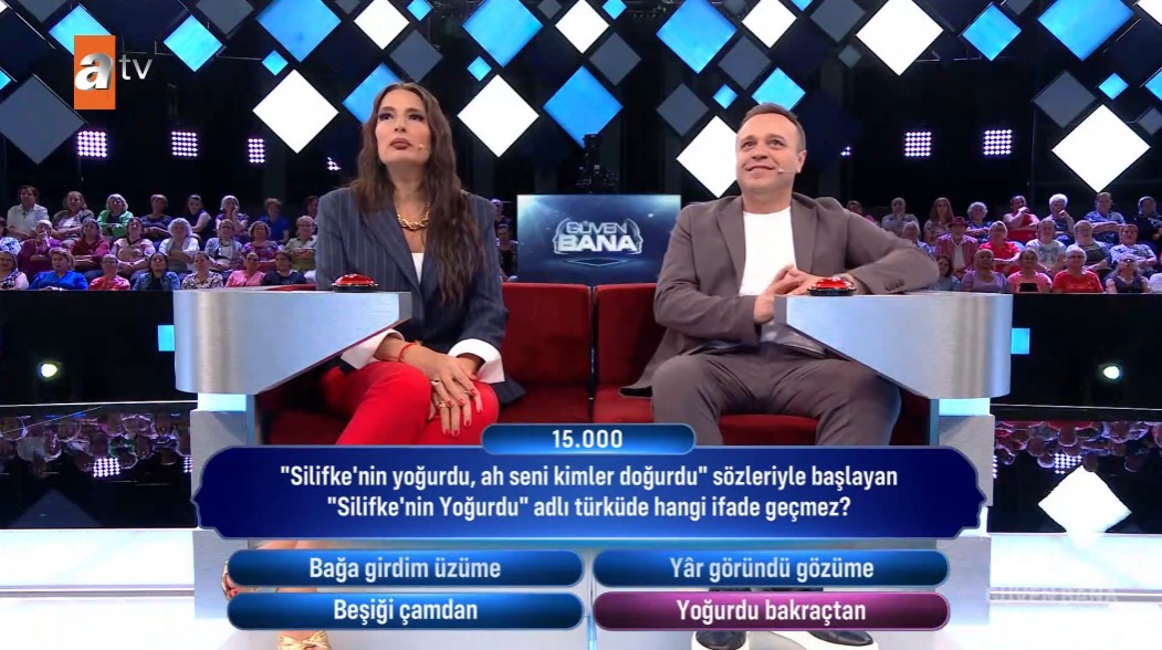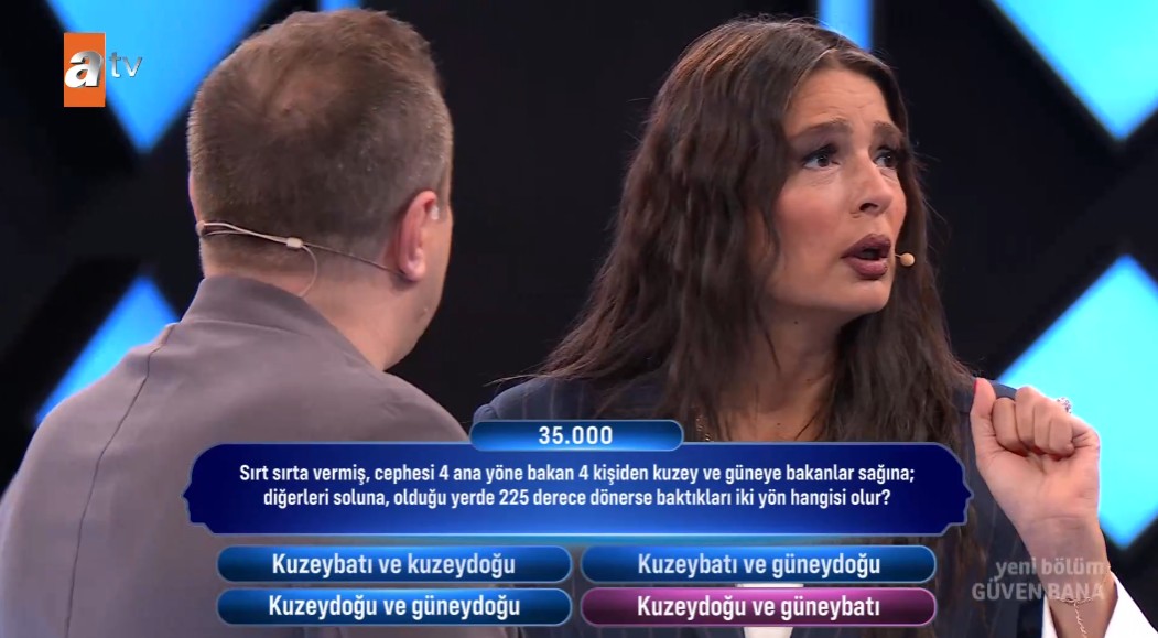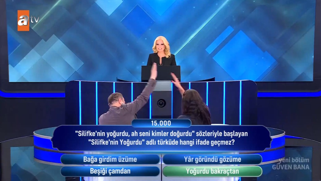 atv'nin sevilen yarışması Güven Bana'da Asuman Krause ve Alper Ateş'in karşısına çıkan futbol sorusunda hem eğlendiren hem de oldukça kahkahaların havada uçuştuğu anlar yaşandı. Asuman Krause gecede futbolu takip ettiğini ama önceliği yakışıklı olan futbolcu olduğunu belirtti. O anlarda izleyenler kahkaha tufanına boğulurken, Asuman Krause ve Alper Ateş'in verdikleri yanıt ile oldukça şaşırttılar.
