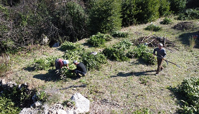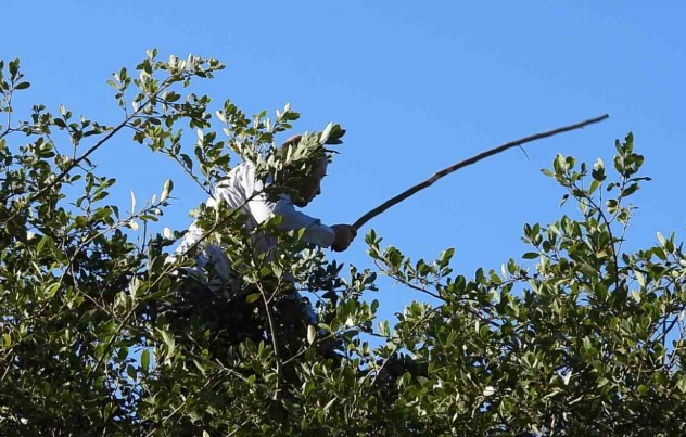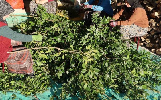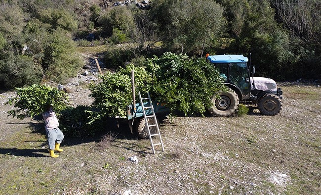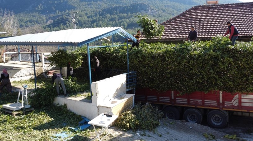 Kırsal mahalle sakinleri, dik yamaçlardaki ağaçlardan topladıkları defne yapraklarını traktör römorklarına yükleyip meydana taşıyor. İlaç, gıda, kimya, boya ve kozmetik gibi birçok sektörde kullanılan defne yaprağının kilosunu bölge halkından 20 liraya alan firmalar, bunları fabrikalarda işlemek üzere İzmir'e götürüyor.