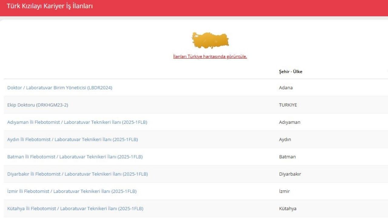 Kızılay, 13 şehirde toplam 50'ye yakın personel alımı yapacak. En az 50 KPSS puanı ile alınacak kadroların yanı sıra KPSS şartı olmadan Laboratuvar Birim Yöneticisi ve temizlik görevlisi alımları da yapılacak. Adana, Adıyaman, Aydın, Batman, Diyarbakır, İzmir, Kütahya, Malatya, Manisa, Şanlıurfa, Tokat, Ankara, İstanbul illerinde istihdam edilmek üzere başvurular alınacak.