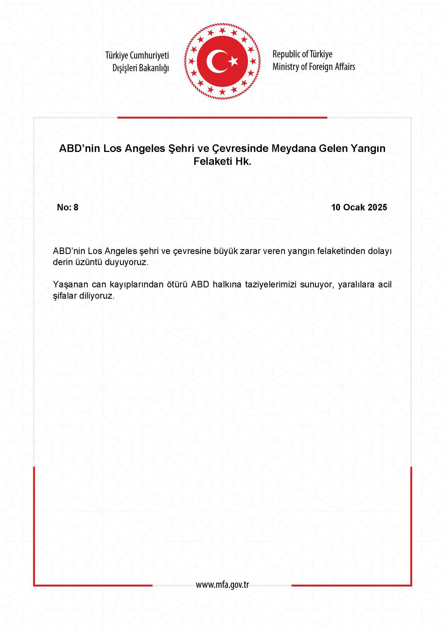 Dışişleri Bakanlığı: ABD'nin Los Angeles şehri ve çevresine büyük zarar veren yangın felaketinden dolayı derin üzüntü duyuyoruz. Yaşanan can kayıplarından ötürü ABD halkına taziyelerimizi sunuyor, yaralılara acil şifalar diliyoruz.