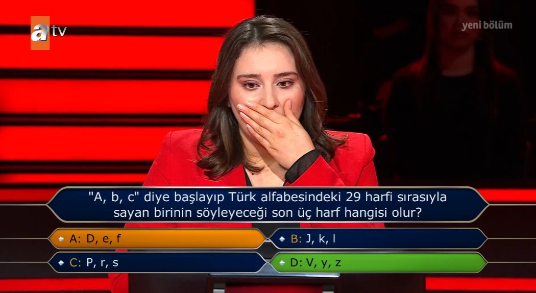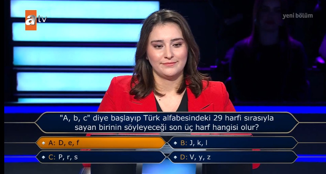 Efe, karşısına çıkan ilk soruda "A, B, C" diye başlayıp Türk alfabesindeki 29 harfi sırasıyla sayan birinin söyleyeceği son üç harf hangisi olur?" sorusunu yanıtladı.