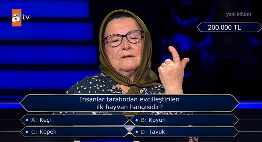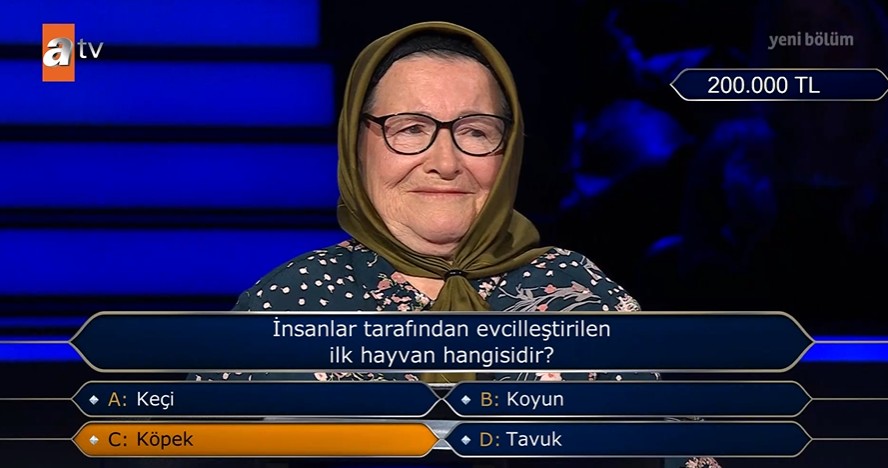 Hiç tereddüt etmeden C) şıkkı 'Köpek' yanıtını veren Azize Teyze, doğru cevapla 200 bin TL'lik ödülün sahibi oldu.