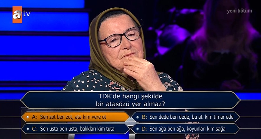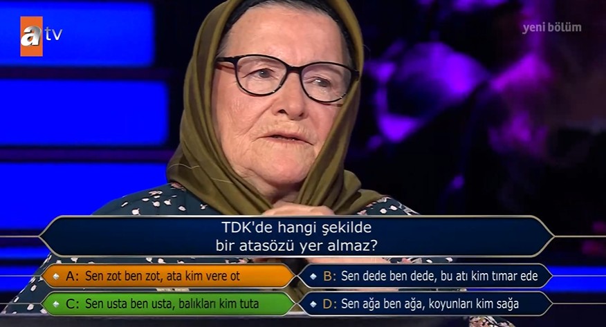 Ekranların en çok sevilen programı Kim Milyoner Olmak İster her hafta olduğu gibi bu hafta da milyonlarca izleyiciyi ekran başına kilitledi. Birbirinden eğlenceli yarışmacıların katıldığı programda heyecan dolu anlar yaşandı. Bulgaristan göçmeni 76 yaşındaki Azize Vatansever, 200 binlik soruyu doğru yanıtlayarak büyük ödülün kilidini açtı. Vatansever'e yöneltilen TDK'nin kabul ettiği atasözü sorusu ise geceye damga vurdu.