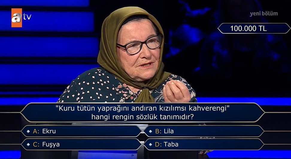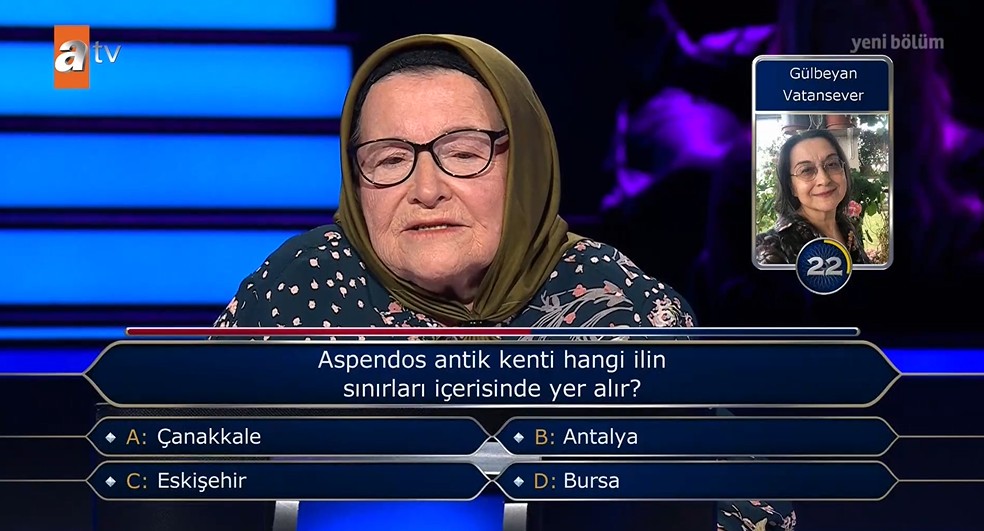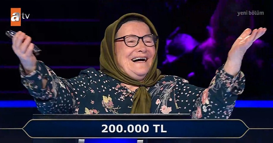Yarışma süresince tüm sorulara doğru yanıt veren Azize Vatansever, en sonunda 200 bin TL'lik büyük ödül sorusuna ulaşmayı başardı. Oktay Kaynarca'nın sunduğu programda gelen soru şöyleydi: