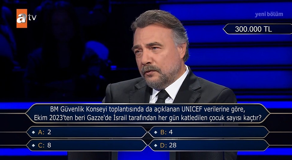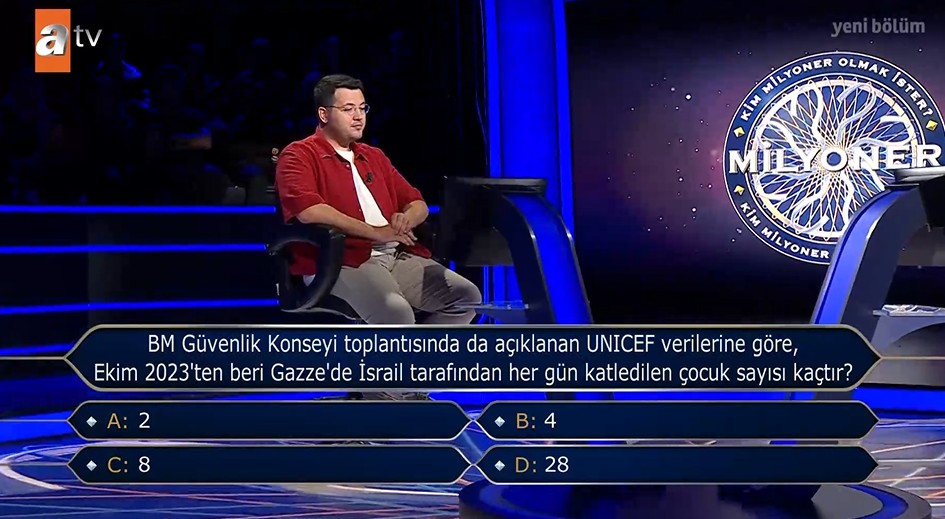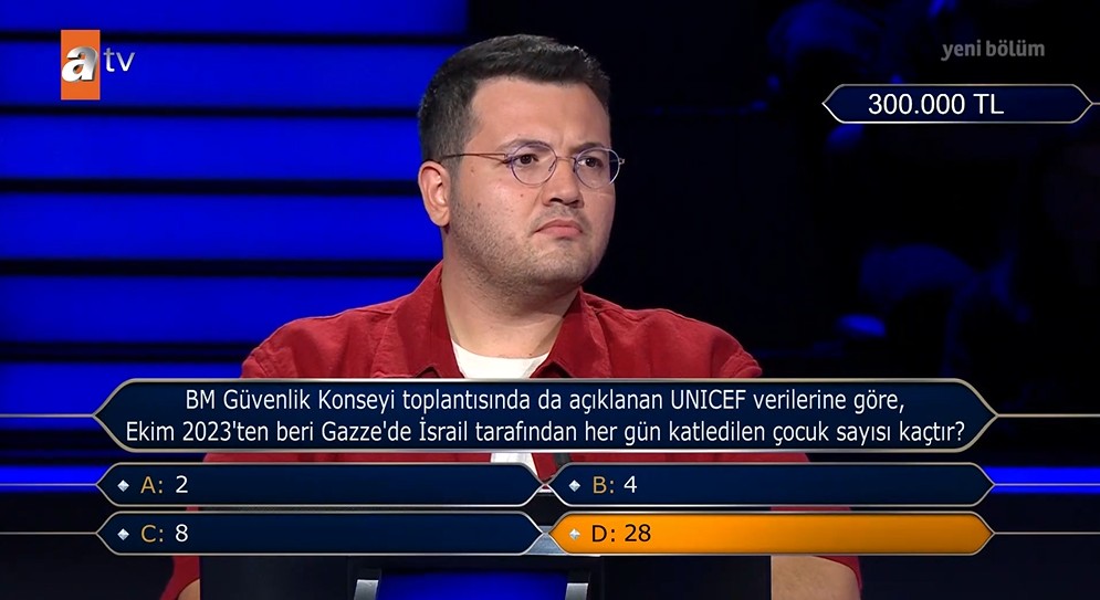 Sorunun yanıtını uzun süre düşünen yarışmacı İsrail'in her gün Gazze'de katlettiği çocuk sayının 28 olduğunu belirterek D şıkta son kararını verdi.