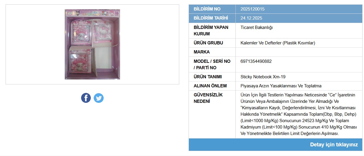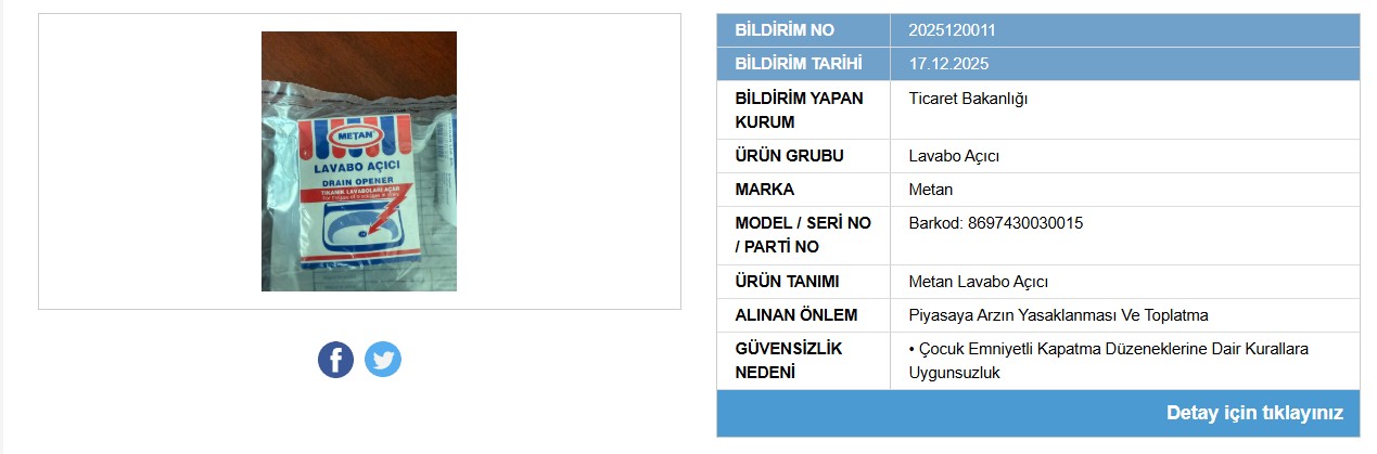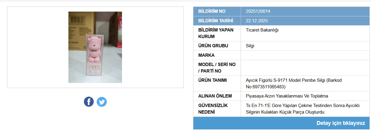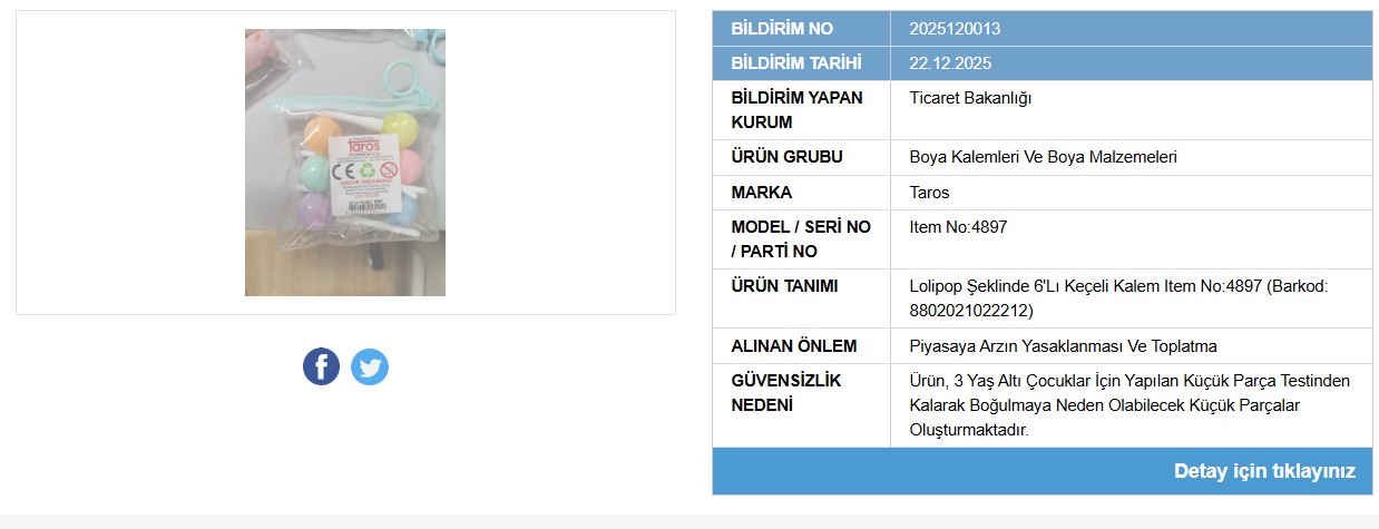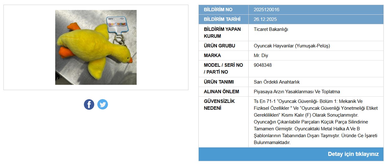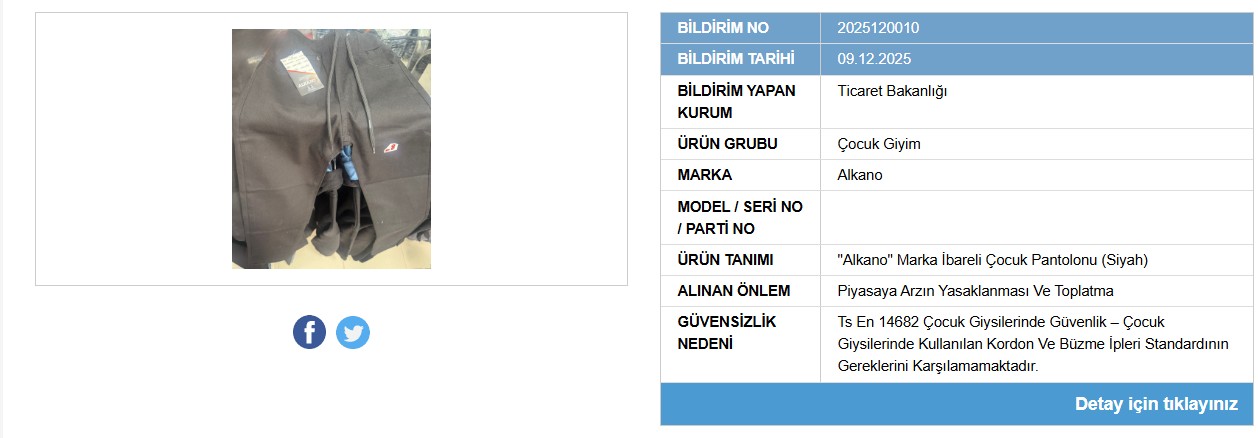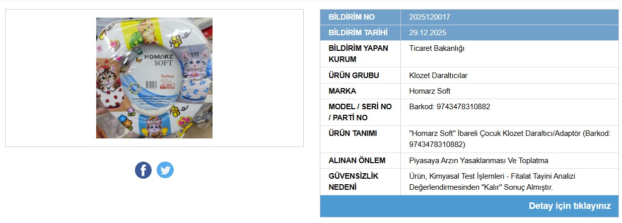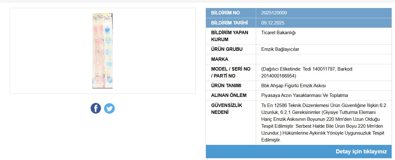 Ticaret Bakanlığı, piyasa gözetimi ve denetimi faaliyeti gerçekleştiren yetkili kuruluşlar tarafından güvensizliği tespit edilen ürünleri Güvensiz Ürün Bilgi Sistemi'nde ilan etmeye devam ediyor. Bakanlık, Güvensiz Ürün Bilgi Sistemi (GÜBİS) üzerinden yaptığı duyuruda, çocuk güvenliğini tehdit eden bir ürün için toplatma kararı aldığını duyurdu.