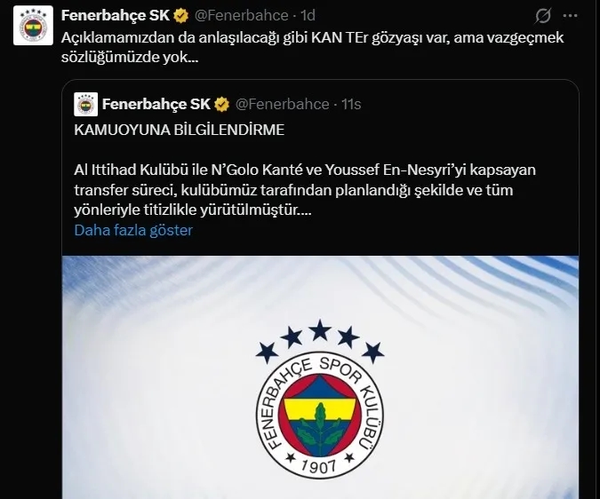 Fenerbahçe, uzun süredir gündeminde yer alan N'Golo Kante transferinde mutlu sona ulaştı. FIFA'dan alınan onayın ardından Youssef En-Nesyri'nin Al-Ittihad'a transferi resmiyet kazanırken, sarı-lacivertli ekip Kante'yi kadrosuna kattı. Fenerbahçe, yıldız futbolcunun transferini Türkiye Futbol Federasyonu'na resmen bildirdi. N'Golo Kante'nin bugün İstanbul'a gelmesi beklenirken, sarı-lacivertli kulüp transferle ilgili dikkat çeken bir paylaşımda da bulundu.