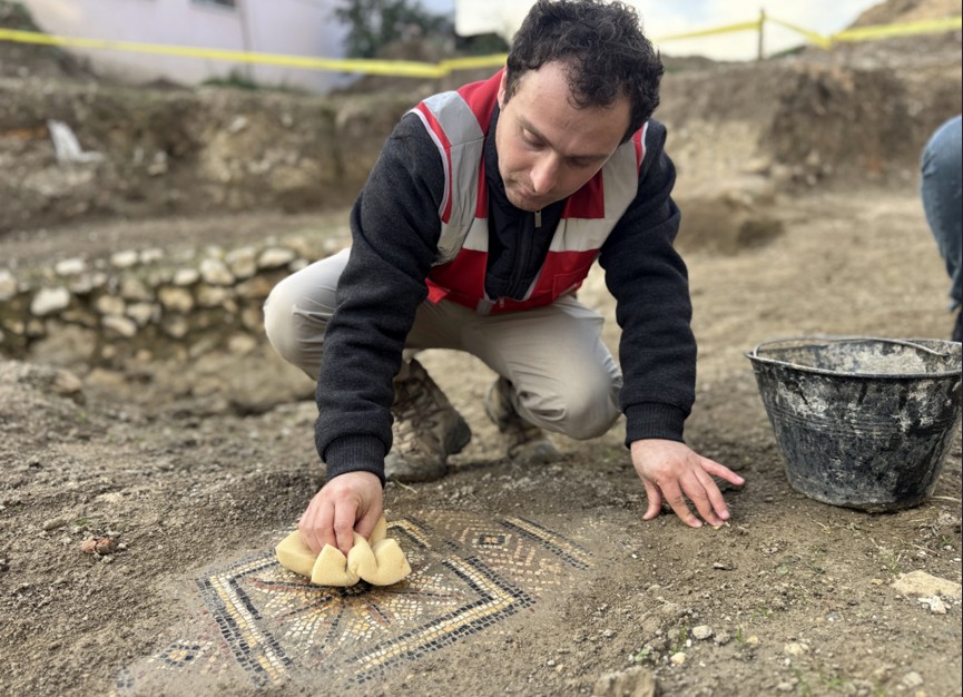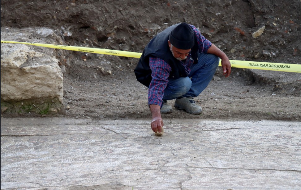 Binanın temel kazısı sırasında işçilerin mozaikli bir alana rastlaması üzerine inşaat çalışması durduruldu.