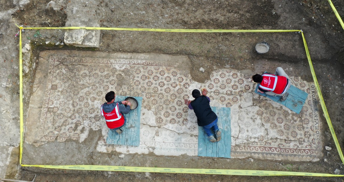 Görenleri hayrete düşüren görüntüler Hatay'da kayda geçti. Depremde yıkılan bir binanın enkazının kaldırıldığı alanda yapılan temel kazısı sırasında, Geç Antik Çağ'a ait Grekçe yazıtlı taban mozaiği gün yüzüne çıkarıldı. Beklenmedik keşif, bölgenin tarihi geçmişine ışık tutarken uzmanları da alarma geçirdi.