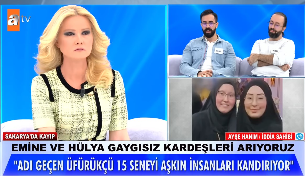 Müge Anlı'nın programında işlenen konu akıllara durgunluk verdi! Emin ve Resul Gaygısız kardeşler, Almanya'dan Türkiye'ye kaçan eşlerini aramak için Müge Anlı'ya başvurdu. İki kardeş, eşlerinin üfürükçünün sözüyle kaçtıklarını söyledi. Üstelik eşleri hemşireydi. Müge Anlı ise o üfürükçüye ulaştı. Anlı, anlatılanlar karşısında sinirlerine hakim olmadı.