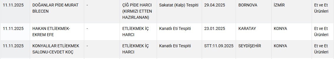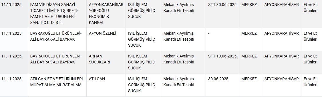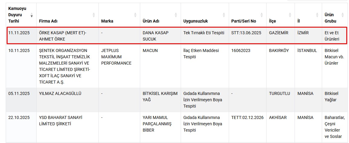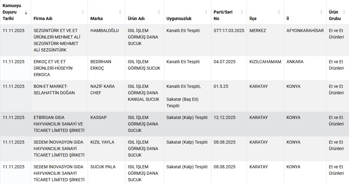 Tarım ve Orman Bakanlığı, insan sağlığını tehdit eden taklit ve tağşiş yapılan ürünlerin listesini kamuoyuyla paylaştı. Yapılan denetimler sonucu İzmir'deki Örke Kasap isimli iş yerinde satılan sucukta tek tırnaklı et tespit edildi. Ayrıca Afyon bölgesinde yapılan kontrollerde birçok sucukta kanatlı eti tespit edildi.