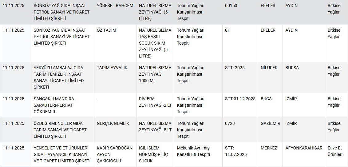 Tarım ve Orman Bakanlığı, insan sağlığını tehdit eden taklit ve tağşiş yapılan ürünlerin listesini yayınladı. İzmir'deki Örke Kasap isimli dükkanda sucukta tek tırnaklı eti tespit edildi. Öte yandan Tekirdağ, Aydın ve Bursa gibi illerde üretilen çok sayıda zeytinyağına tohum yağı karıştırıldığı ortaya çıktı. Ayrıca Afyon bölgesindeki çok sayıda sucukta kanatlı eti tespit bulundu. İşte detaylar...