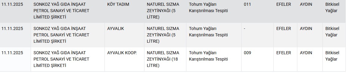 Bakanlık açıklamasına göre, Tekirdağ, Aydın ve Bursa illerinde üretilen çok sayıda zeytinyağına ise tohum yağı karıştırıldığı ortaya çıktı.