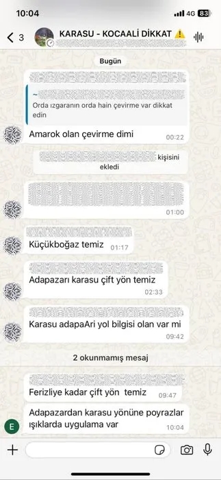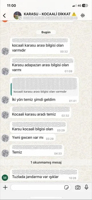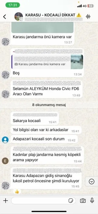 Durumun üzerine harekete geçen ekiplerce yapılan çalışma neticesinde; 22 Şubat 2024 tarihinde kurulan WhatsApp grubunda Kocaali, Ferizli, Söğütlü ve Adapazarı ilçeleri gidiş-dönüş istikametinde D-650 kara yolu üzerinde kurulan jandarma ile polis uygulama noktalarının anlık olarak paylaşıldığını tespit edildi.