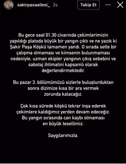 Dizinin resmi Instagram hesabından yapılan açıklamaya göre, yangın 26 Aralık saat 01.30 civarında başladı. Olay sırasında set ekibi büyük bir panik yaşarken, yangının kontrol altına alınması için yoğun bir mücadele verildi.