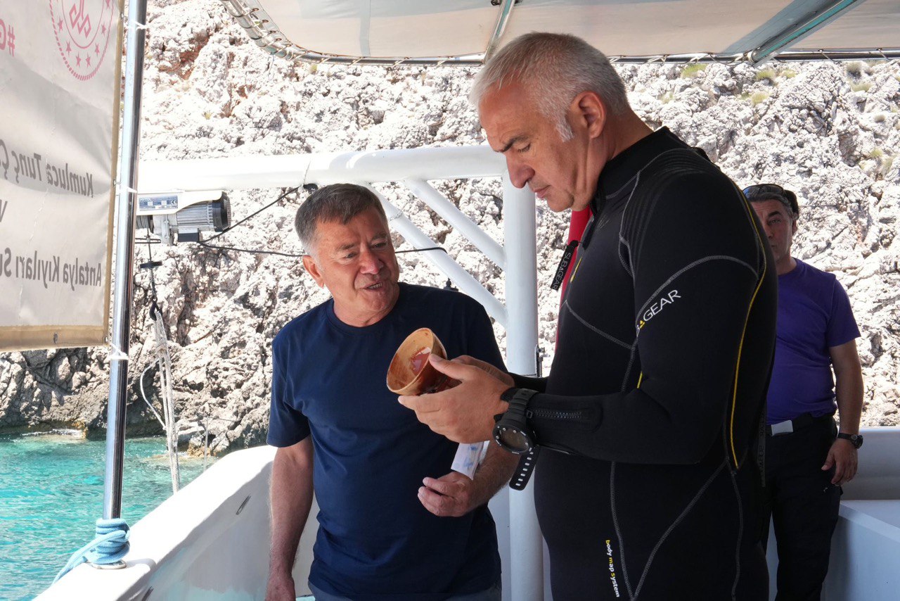 Kültür ve Turizm Bakanı Mehmet Nuri Ersoy, Akdeniz'in derinliklerine dalarak dünya arkeolojisinde çığır açacak bir keşfi yerinde inceledi.