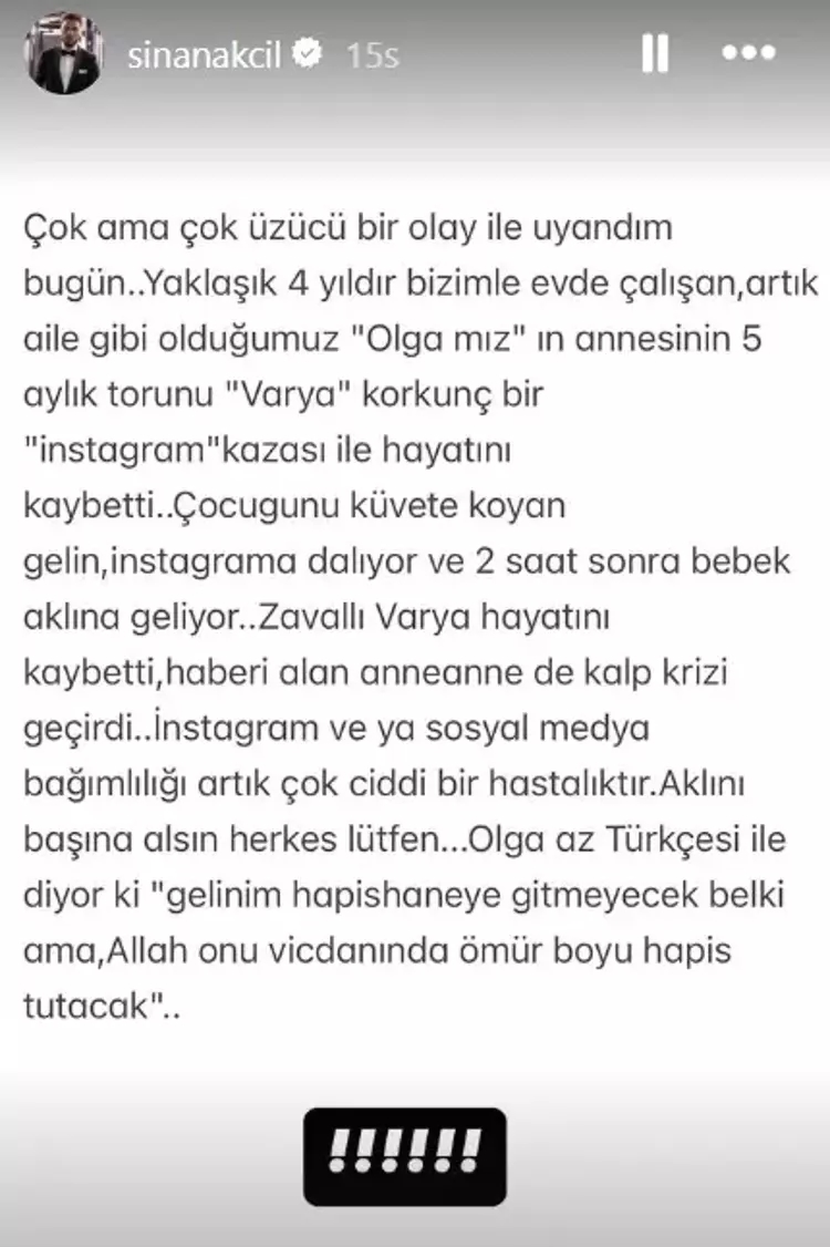 Instagram bağımlılığı yüzünden bir bebeğin yaşamını yitirdiğini söyleyen Akçıl, paylaşımında şu ifadeleri kullanmıştı: