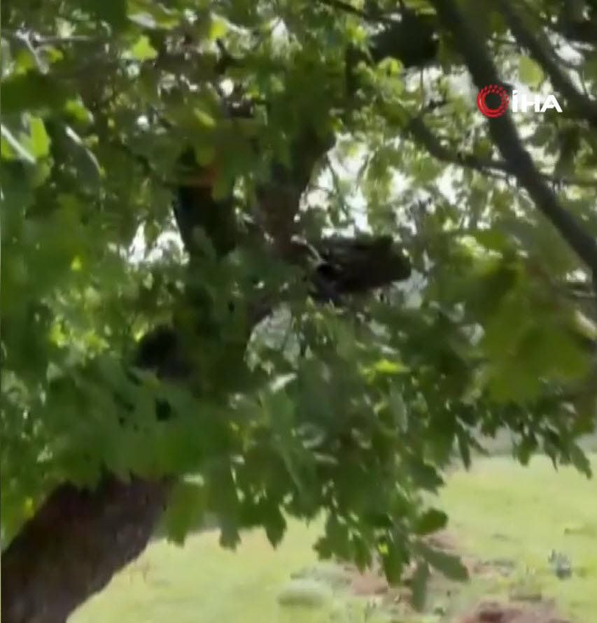 Yozgat'ın Saraykent ilçesinde hayvanlarını otlatan İsmail Cengizer, ağacın gölgesine geçince dalda kamufle olan yılanla karşı karşıya kaldı. O anları cep telefonu ile kayda aldı.