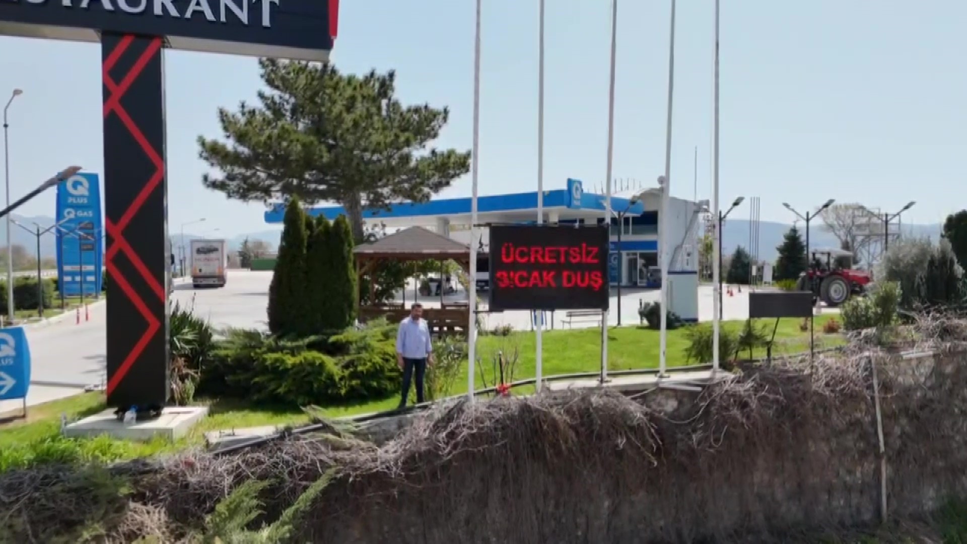 Amasya-Suluova karayolunda seyir halindeki sürücüler, akaryakıt fiyatlarını kontrol etmek için başlarını tabelaya çevirdiklerinde beklenmedik bir duyuruyla karşılaşıyor. Panonun en dikkat çekici yerinde yer alan "ücretsiz sıcak duş" ibaresi, gece gündüz fark edilebilen ışıklı yapısıyla yoldan geçenleri istasyona davet ediyor.