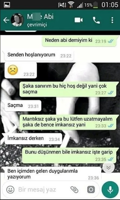 Kendisine 'ağabey' diyen genç kıza art arda emojiler gönderen Akyolcular, genç kızın tüm uyarılarına rağmen "Bana abi deme, senden hoşlanıyorum" diyerek tacize devam etmişti.