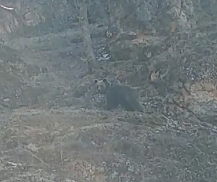 Tunceli'de Munzur Vadisi Milli Parkı'nda koruma ve kontrol faaliyeti gerçekleştiren doğa koruma görevlileri Murat Özer ve Azat Özel, kayalıkta avladığı yaban keçisi leşine ulaşmaya çalışan boz ayıya denk geldi.