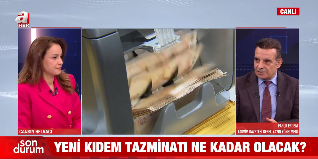 Yeni dönemde kıdem tazminatı tavanı ne kadar olacak? Kıdem tazminatı nasıl hesaplanır? Takvim Gazetesi Genel Yayın Yönetmeni Faruk Erdem, A Haber canlı yayınında yanıtladı. Erdem, Milli Eğitim Bakanı Yusuf Tekin'e bir çağrıda bulundu.