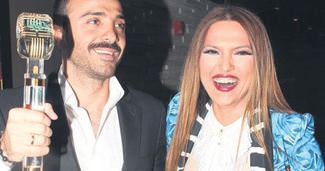 Demet Akalın objektifler karşısında mutluluk pozu verirken, Okan Kurt ise eşinin ödülünü Şampiyonluk Kupası gibi havaya kaldırdı.