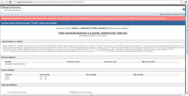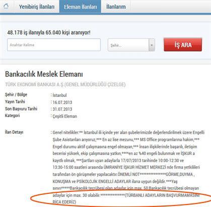 "Türkiye İş Kurumu'nun Türk Ekonomi Bankası (TEB) adına açılan ilanda yer alan "türbanlı adayların başvurmamasını rica ederiz" ibaresi ilanın asıl metninde bulunmamakta olup İŞKUR Ümraniye Hizmet Merkezi birimi tarafından TEB'in bilgisi ve onayı dışında eklenmiştir"