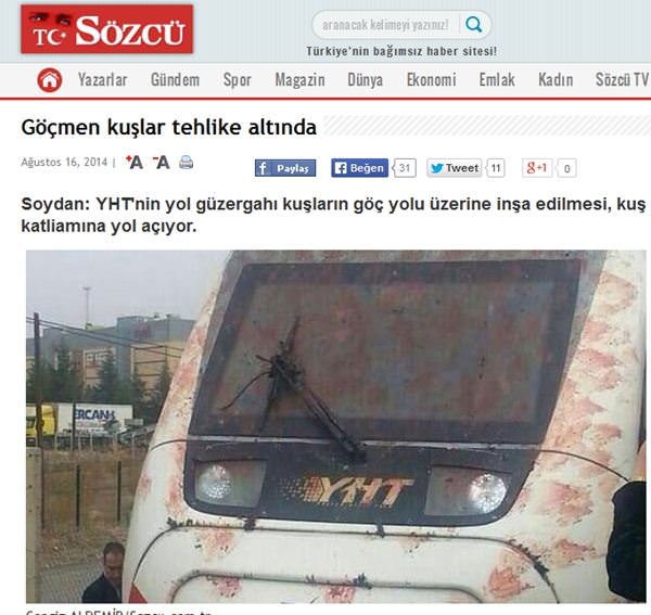 2013 yılının Kasım ayında Ankara'dan Eskişehir'e giden Yüksek Hızlı Tren (YHT), Eskişehir yakınlarında kuş sürüsüne çarpmış ve trenin ön tarafını kuşların kanı kaplamıştı.