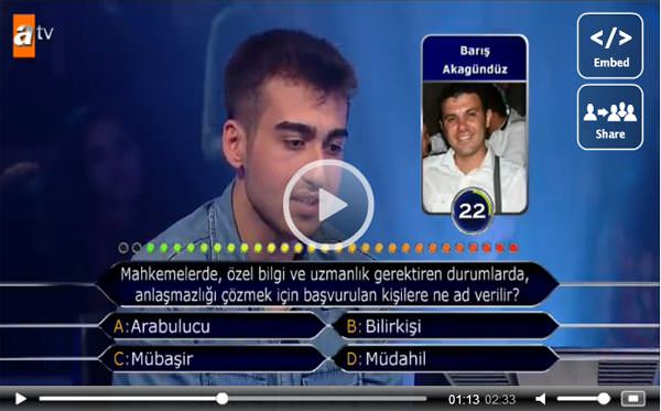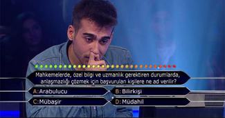 "Mahkemede, özel bilgi ve uzmanlık gerektiren durumlarda, anlaşmazlığı çözmek için başvurulan kişilere ne ad verilir?" sorusuna yanlış cevap veren yarışmacıya Selçuk Yöntem, "sana hukuk hayatında başarılar diliyorum" dedi.