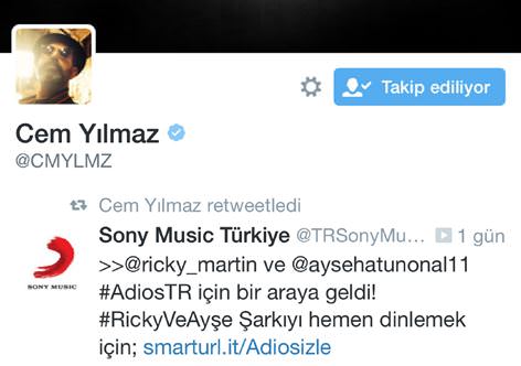 Sosyal paylaşım sitesi twitter'da 8 milyonu aşan takipçi sayısıyla Türkiye rekorunu elinde bulunduran Cem Yılmaz, aşk için kural bozdu. Twitter'ı aktif olarak kullanmayan hatta bu nedenle sevenlerinin sitemine maruz kalan ünlü şovmen, dün twitter'daki paylaşımıyla "Aşk adama neler yaptırıyor!" dedirtti. Cem Yılmaz, birkaç aydır aşk yaşadığı Ayşe Hatun Önal'ın dünyaca ünlü yıldız Ricky Martin'le düet yaptığı 'Adios' isimli şarkıyı profilinden paylaştı.