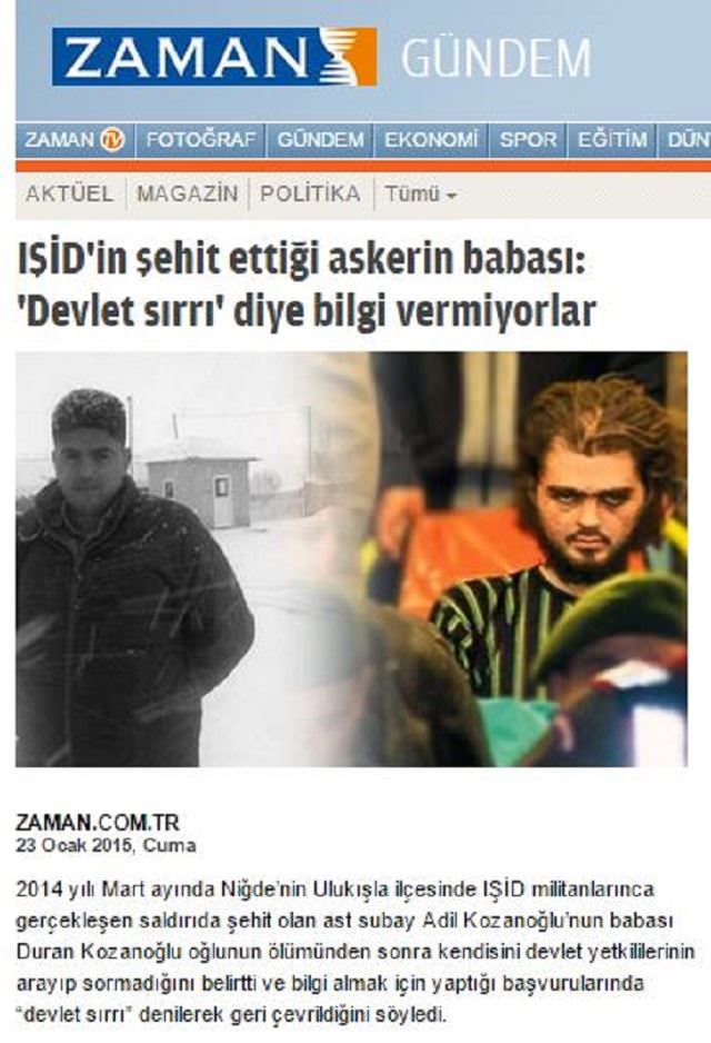 Niğde'nin Ulukışla ilçesinde, 20 Mart 2014'te rutin yol kontrolü sırasında güvenlik güçlerine ateş açılması sonucu şehit olan Jandarma Astsubay Adil Kozanoğlu'nun babası Duran Kozanoğlu, Zaman Gazetesi'nde çıkan 'devletin kendileriyle ilgilenmediği' yönündeki haberlerin gerçeği yansıtmadığını söyledi.