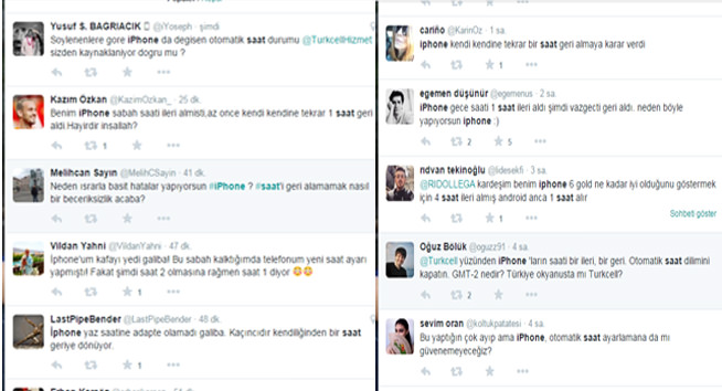 Türkiye 3:00'da saatlerini ileri alırken Apple kullanıcıları büyük sıkıntı yaşadı. Apple, otomatik olarak yapılan saati ileri alma işlemini 10'a kadar yapmayınca kullanıcılar mağdur oldu.iPhone, iPad ve iPod kullanıcıları, saatlerin ileri alınmaması birçok vatandaşın işlerini aksattı.