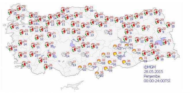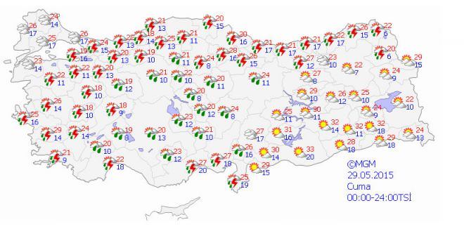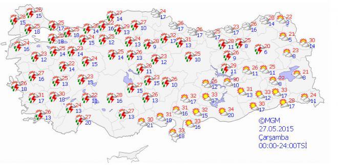 27 Mayıs Çarşamba günü yurdun iç ve batı kesimlerinde sağanak yağış görülecek. Yağışlar etkisini cuma gününe kadar sürdürecek. İstanbul, Ankara, İzmir , Bursa ve Antalya'da yer yer etkili sağanak yağış görülecek.