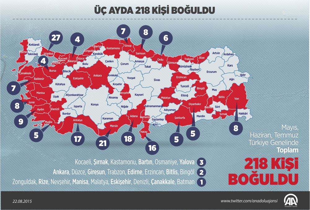 Ülke genelinde Mayıs, Haziran ve Temmuz aylarında, akarsu, göl, gölet, baraj, su kanalı ve denizlerde 218 kişi boğularak yaşamını yitirdi.