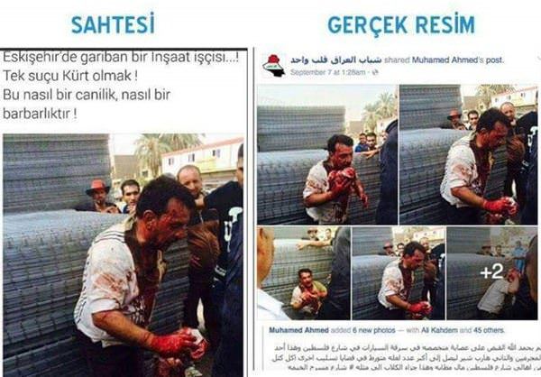 Sosyal medyada paylaşılan bir fotoğrafa göre; Kürt olduğu iddia edilen bir şahıs Eskişehir'de darp edildi. Ancak olayın aslı çok geçmeden anlaşıldı.