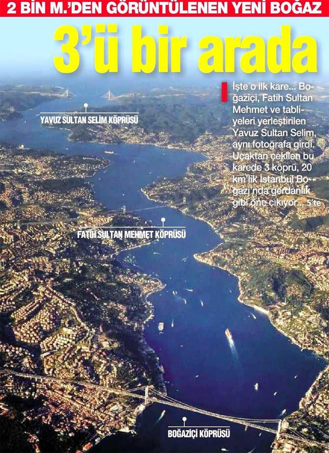 Uçaktan çekilen bu fotoğraf, İstanbul Boğazı'nın ikisi tamamlanmış, biri de açılış için gün sayan 3 gerdanlığını bütün güzelliğiyle ortaya çıkardı. Boğaz'ın Tarihi Yarımada üzerinden çekilen fotoğrafında, Boğaziçi Köprüsü, Fatih Sultan Mehmet Köprüsü ve henüz tabliyeleri yerleştirilmekte olan Yavuz Sultan Selim Köprüsü bir gerdanlık gibi öne çıkıyor. 6 bin metre mesafeden çekilen fotoğrafta, 20 kilometrelik İstanbul Boğazı'nın kıvrımları, tarihi yapıları, deniz trafiği, yeşil alanları tüm görkemiyle görülüyor. Özellikle Anadolu yakasındaki yeşil alanlar dikkat çekerken, sahillerdeki yapılaşma da göze çarpan unsurlardan biri...