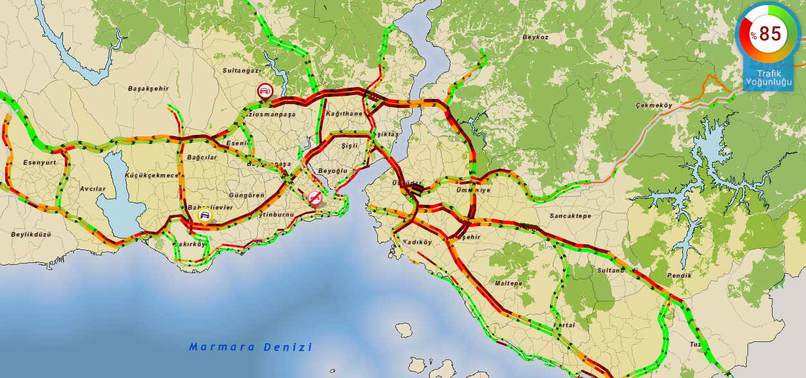 saat 17.40 itibariyle İstanbul Büyükşehir Belediyesi'nin, "Yoğunluk Haritası"nda trafik yoğunluğu yüzde 81'e ulaştı.