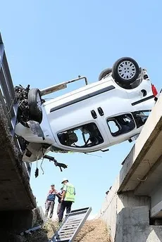 Yolun gidiş ve geliş şeritlerindeki iki köprü arasında kalan araç, 2 kurtarma aracıyla bir saatlik çalışmayla çıkarıldı.