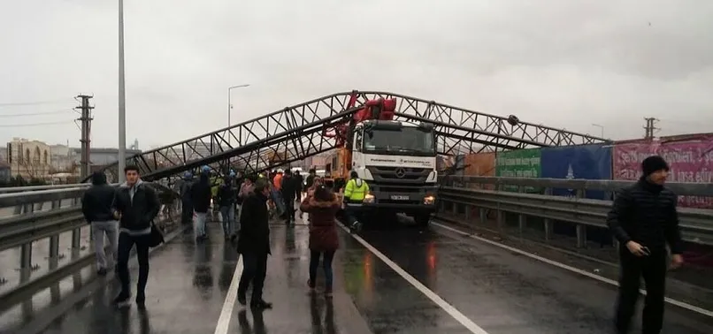 Olumsuz hava koşullarının günlük hayatı olumsuz etkilediği İstanbul'da, bir vinç fırtına nedeniyle Büyükçekmece'de E-5 karayoluna devrildi. Yoldan geçen bazı araçlar vincin altında kalarak zarar gördü.