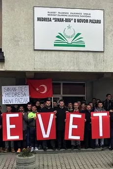 Sırbistan'ın güneyinde, Boşnak nüfusun yoğun yaşadığı Sancak bölgesinin en büyük şehri Novi Pazar'ın en işlek caddelerinden '1 Mayıs' üzerinde bulunan köprüye, 'Evet' yazılı dövizler asıldı.