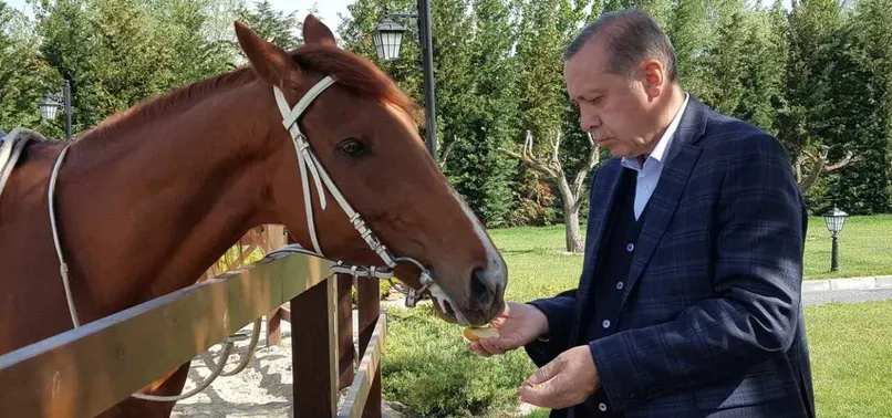 Cumhurbaşkanı Erdoğan ziyaretinde atlarla yakından ilgilendi, yetkililerden bilgi aldı. Erdoğan, atlardan birine elleriyle elma yedirdi.