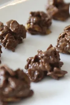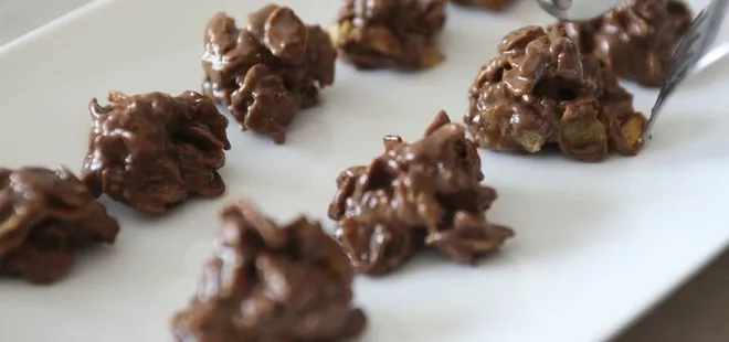 Çikolatayı benmari usulü eritin. Mısır gevreklerini rahatça kullanabileceğiniz genişlikte bir karıştırma kabına alın. Eriyen çikolatayı mısır gevreklerinin üzerine dökün. Çikolatanın mısır gevrekleriyle iyice harmanlanması için bir kaşık kullanıp zarif hareketlerle malzemeleri karıştırın. Son olarak, hazırladığınız karışımı lokmalık porsiyonlar halinde servis tabağına alın. Kurabiyeleriniz soğuduktan sonra afiyetle yiyin.