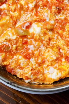 Yumurtaları, tuz ve karabiber ilavesiyle çırpın. Suyunu çeken domatesli harca ekleyin ve aralarda karıştırarak 3- 4 dakika kadar pişirin.
