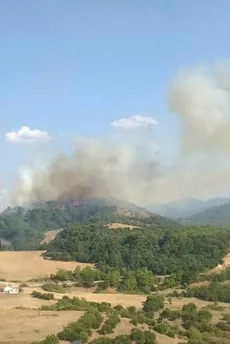 Rüzgarın etkisiyle büyüyen yangına 4 helikopter, 16 arazöz ve 2 dozerle müdahale ediliyor.