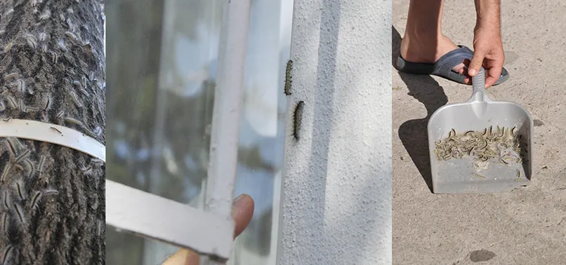 Kocaeli'nin Körfez İlçesi'nde sokakta bulunan ağaçları tırtıllar istila ederken, burada oturanlar zararlının evlerine girmesinden rahatsız oldu. Yaz günü, pencerelerini açamaz, balkona çıkamaz hale gelen aileler, ilaçlama yapılmasını istedi.