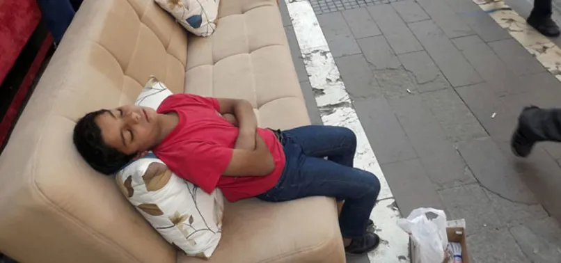 Suriyeli ailelerin çocukları ise genellikle mendil satarak evlerine katkı sağlamaya çalışıyor. İşte bunlardan biri olan Suriyeli bir çocuk, yorgunluğuna dayanamadı ve Dabakhane Mahallesi Halep Caddesi'nde yoğun araç ve insan trafiğine aldırış etmeden kaldırımda satışa sunulan bir kanepe üzerinde uyuyakaldı.