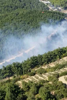 Kızılçam ağaçlarından oluşan ormanlık alandaki yangın, ekiplerin havadan ve karadan müdahalesiyle kontrol altına alındı.