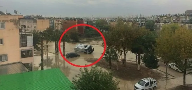 Mersin'de öğleden sonra başlayan sağanak yağmur ve dolu hayatı olumsuz etkiledi. Göreve giden zırhlı polis aracı TOMA, yağmur suyu ile dolan çukura düşerek mahsur kaldı.